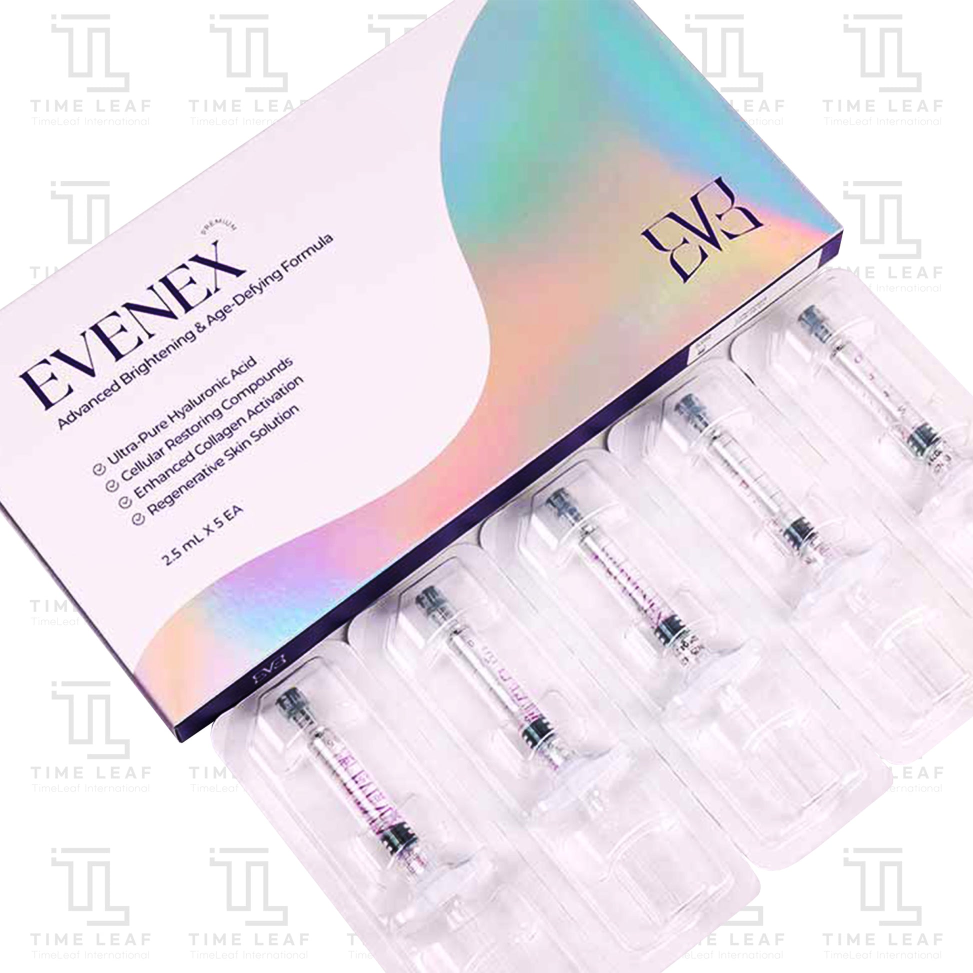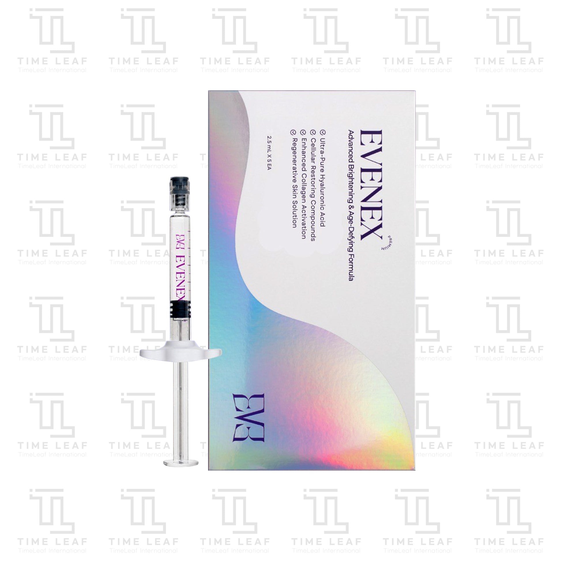 EVENEX is a pure Hyaluronic Acid (HA) skin booster formulated to deliver intense hydration and restore skin elasticity. It deeply moisturizes, smooths fine lines, and enhances skin radiance for a refreshed and youthful appearance.